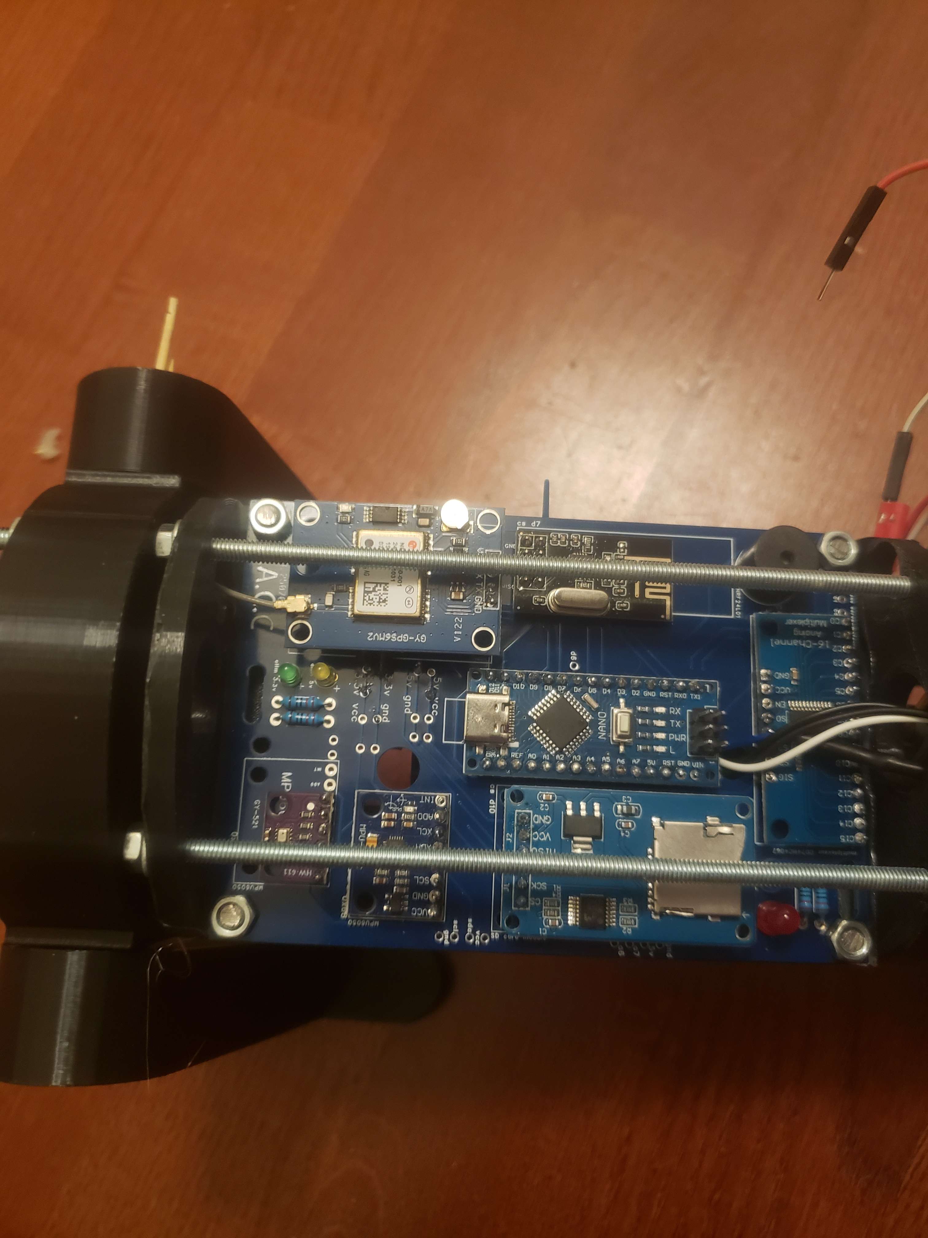 entierement soudé). Tout ce qui a été tésté fonctionne : enregistrement des données dans une carte sd, données gps, barométriques, gyroscopiques, accelerometriques, thermometrique mais aussi la communication