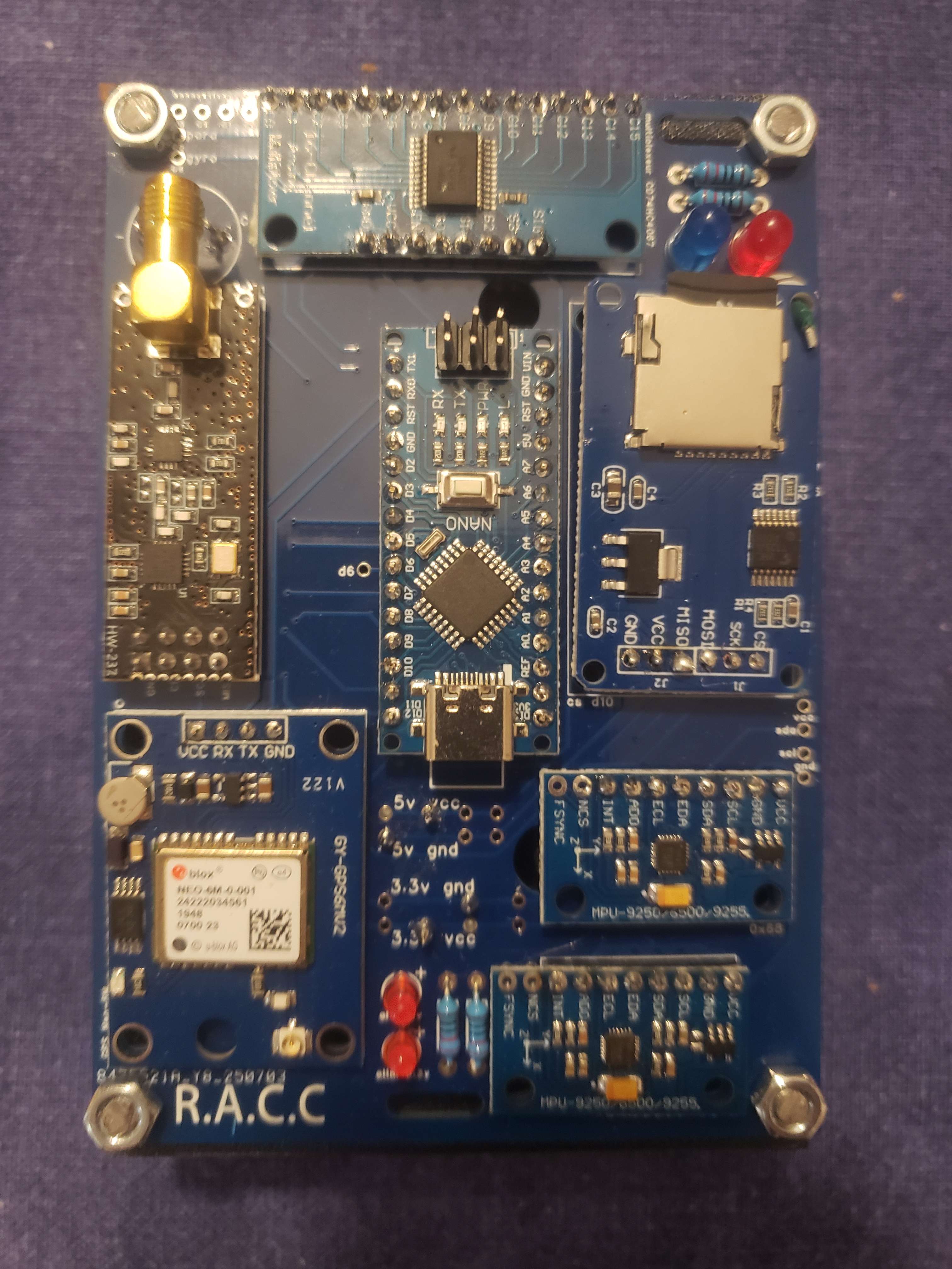 entierement soudé). Tout ce qui a été tésté fonctionne : enregistrement des données dans une carte sd, données gps, barométriques, gyroscopiques, accelerometriques, thermometrique mais aussi la communication