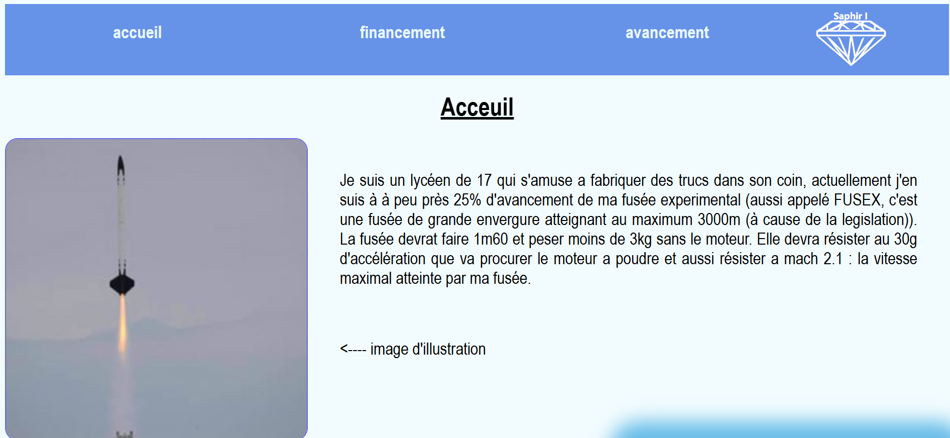 Creation du site internet pour la fusée avec 3 pages (oui je l'ai fait moi même veuillez pardonnez ce site avec cette présentation
